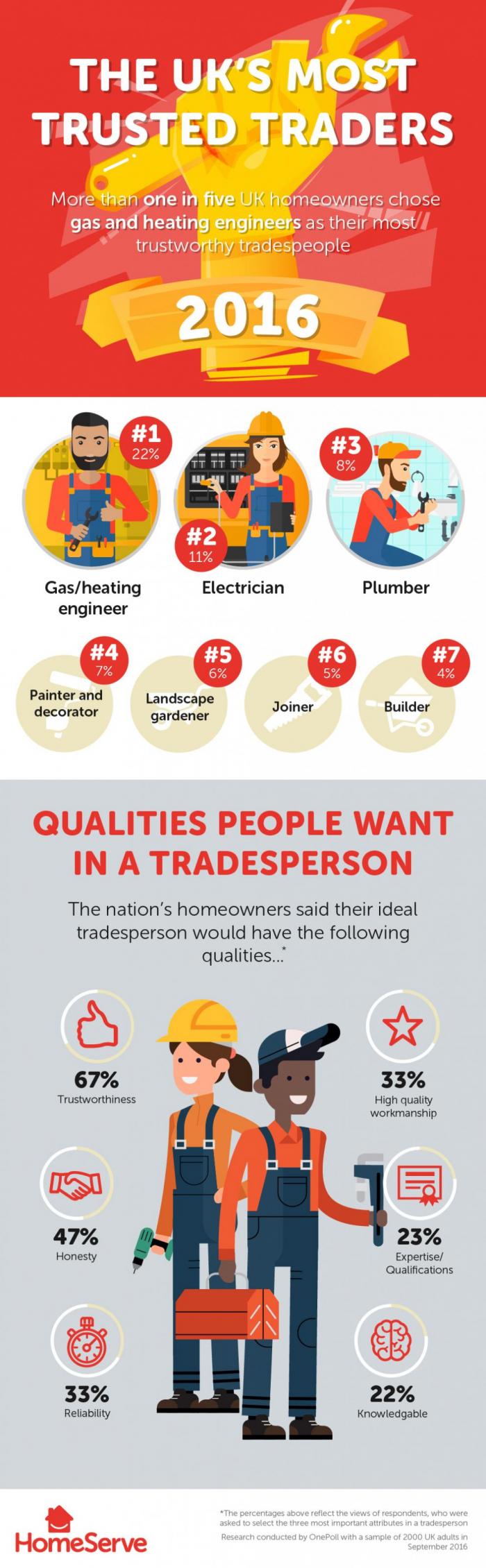 Trustworthiness (67 per cent) is the most important attribute expected of traders by homeowners – with honesty, reliability, high quality workmanship and qualifications also ranking highly in the HomeServe-commissioned study.